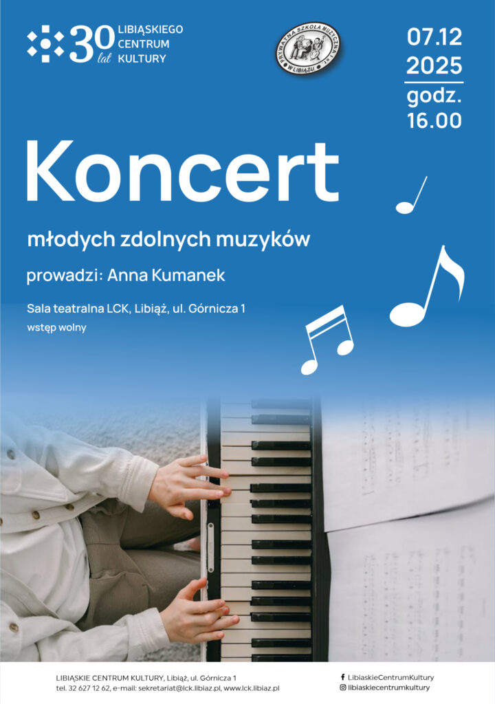 Zapraszamy na koncert młodych zdolnych muzyków w niedziele 7 grudnia 2025 r. o godzinie 16.00 w sali teatralnej LCK.