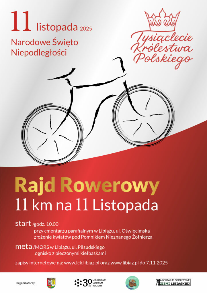 Wspólnie z Gminą Libiąż, grupą Rowerowy Libiąż i Archiwum Społecznym Ziemi Libiąskiej zapraszamy do udziału w rajdzie rowerowym “11 km na 11 Listopada” we wtorek 11 listopada 2025.